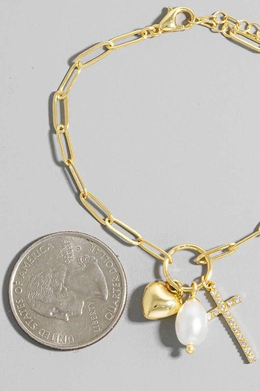 Gold Dipped Cz Cross Heart And Pearl Charms Chain Bracelet
