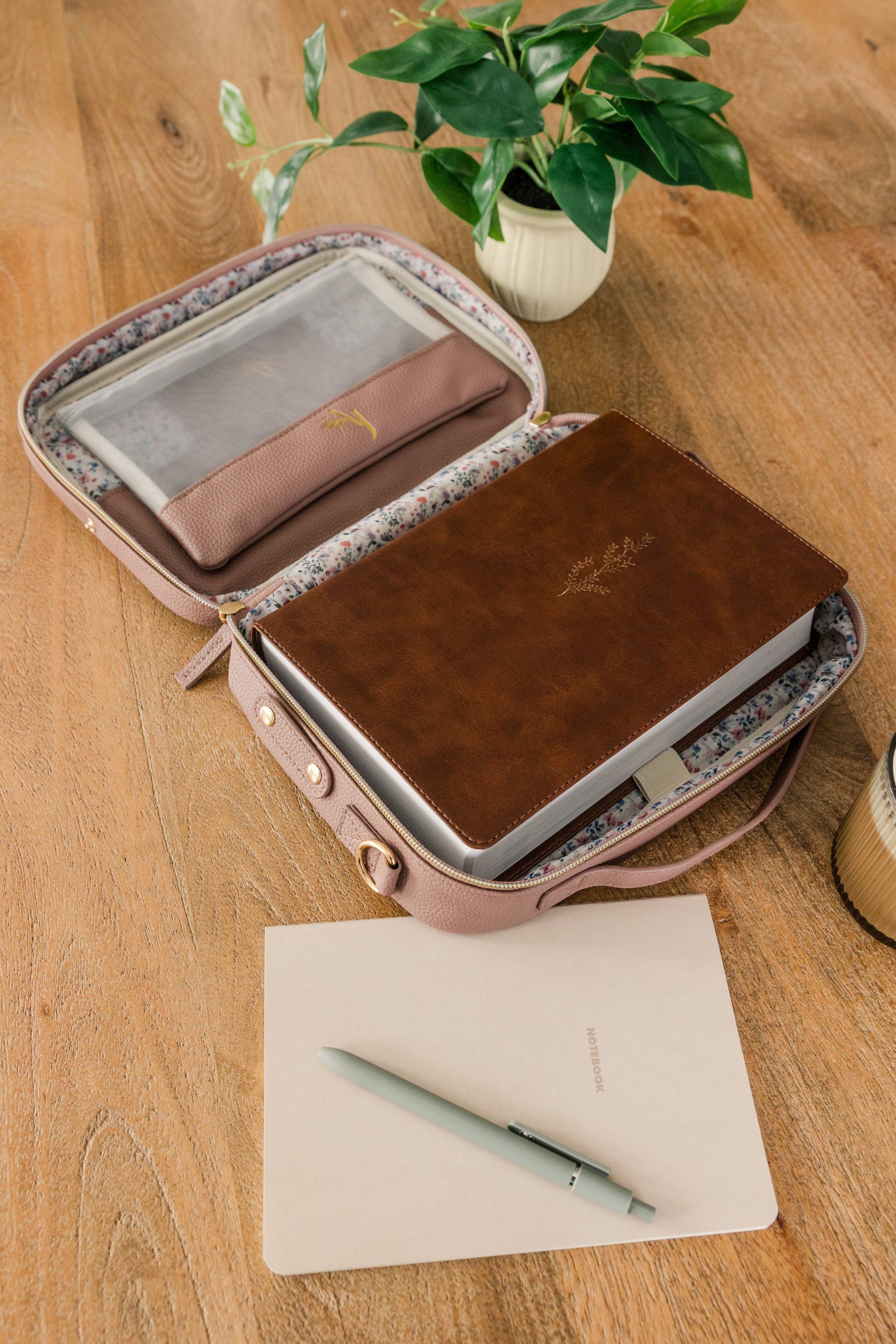 PREORDER!! The NEW Ever, AJ Bible Bag in Mocha is for the women who like to carry the essentials with plenty of room for all their Bible study supplies. Our vegan leather Bible bag is equipped with a detachable crossbody strap for an effortless carry, and a convenient spine handle.