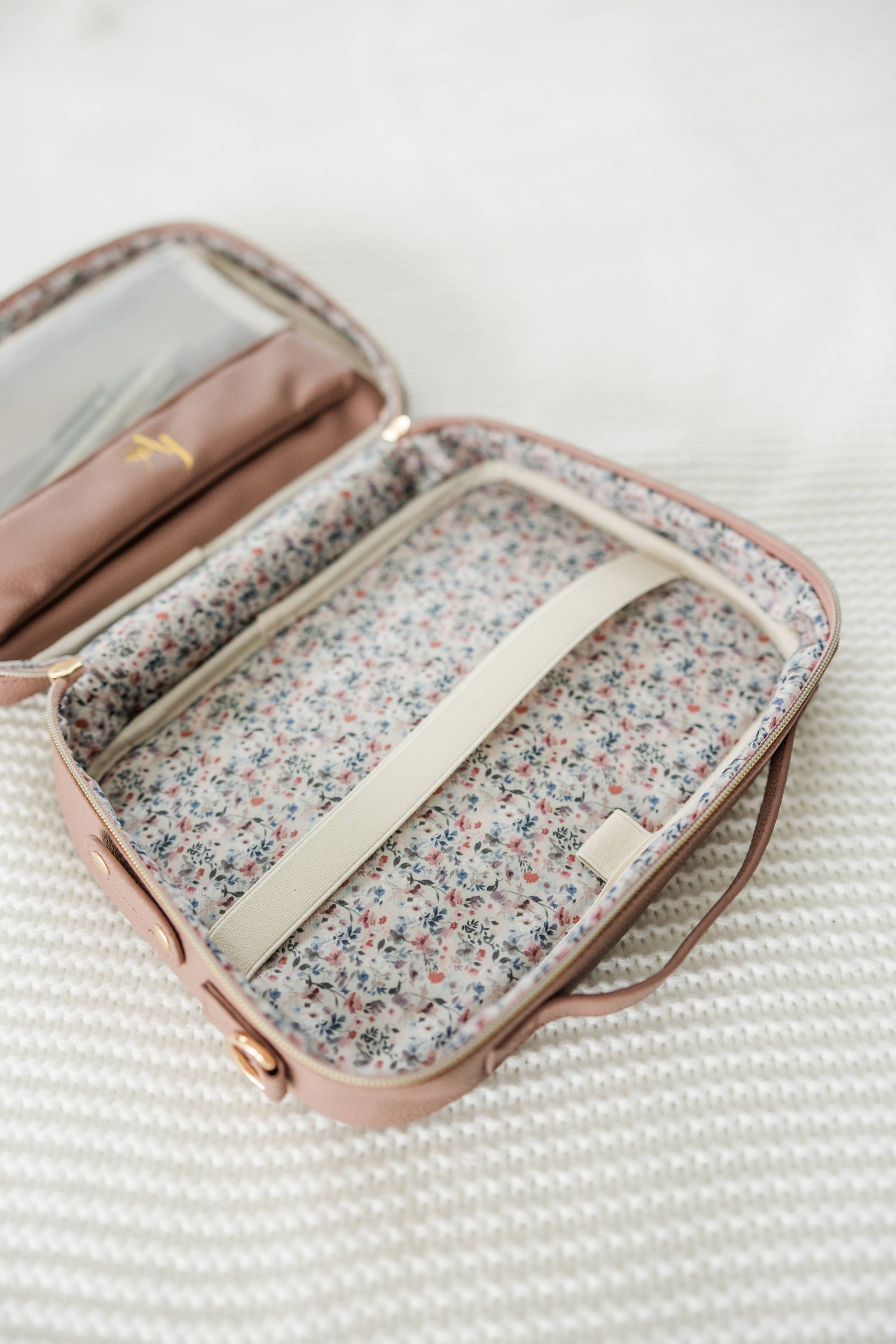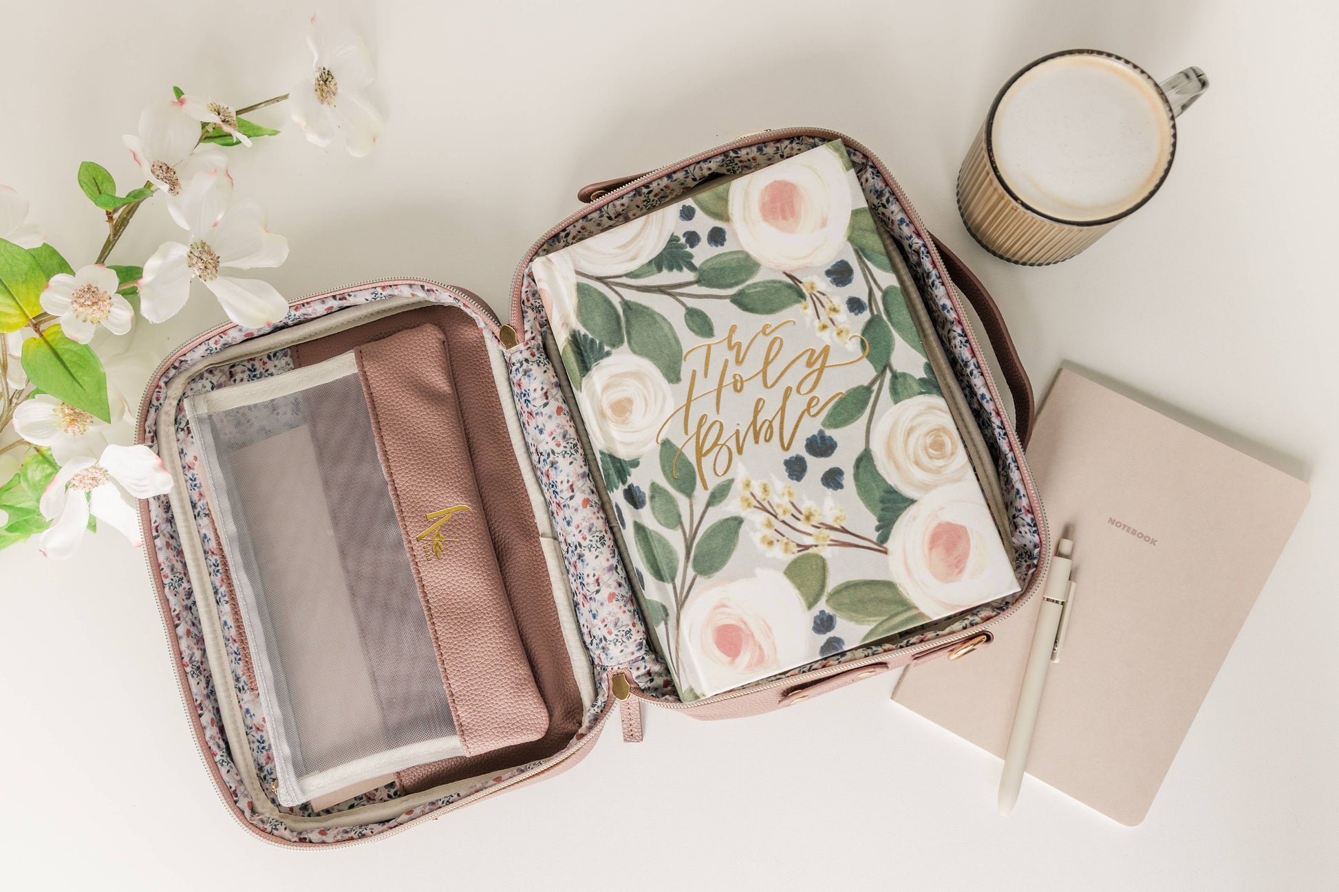 The Ever, AJ Bible Bag is crafted from Premium water-resistant Vegan Leather, complimented with beautiful gold accents and a heat-stamped gold foil floral design on the front.