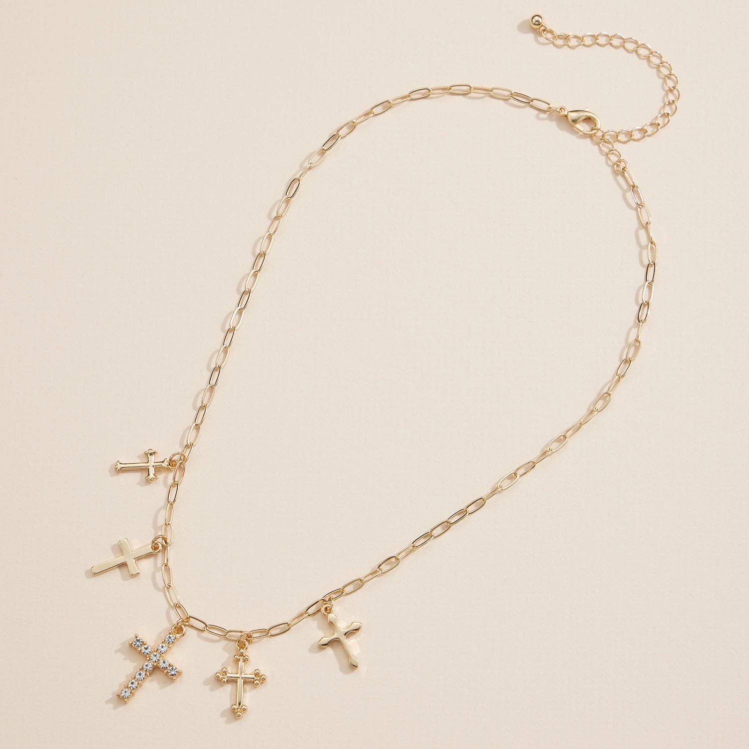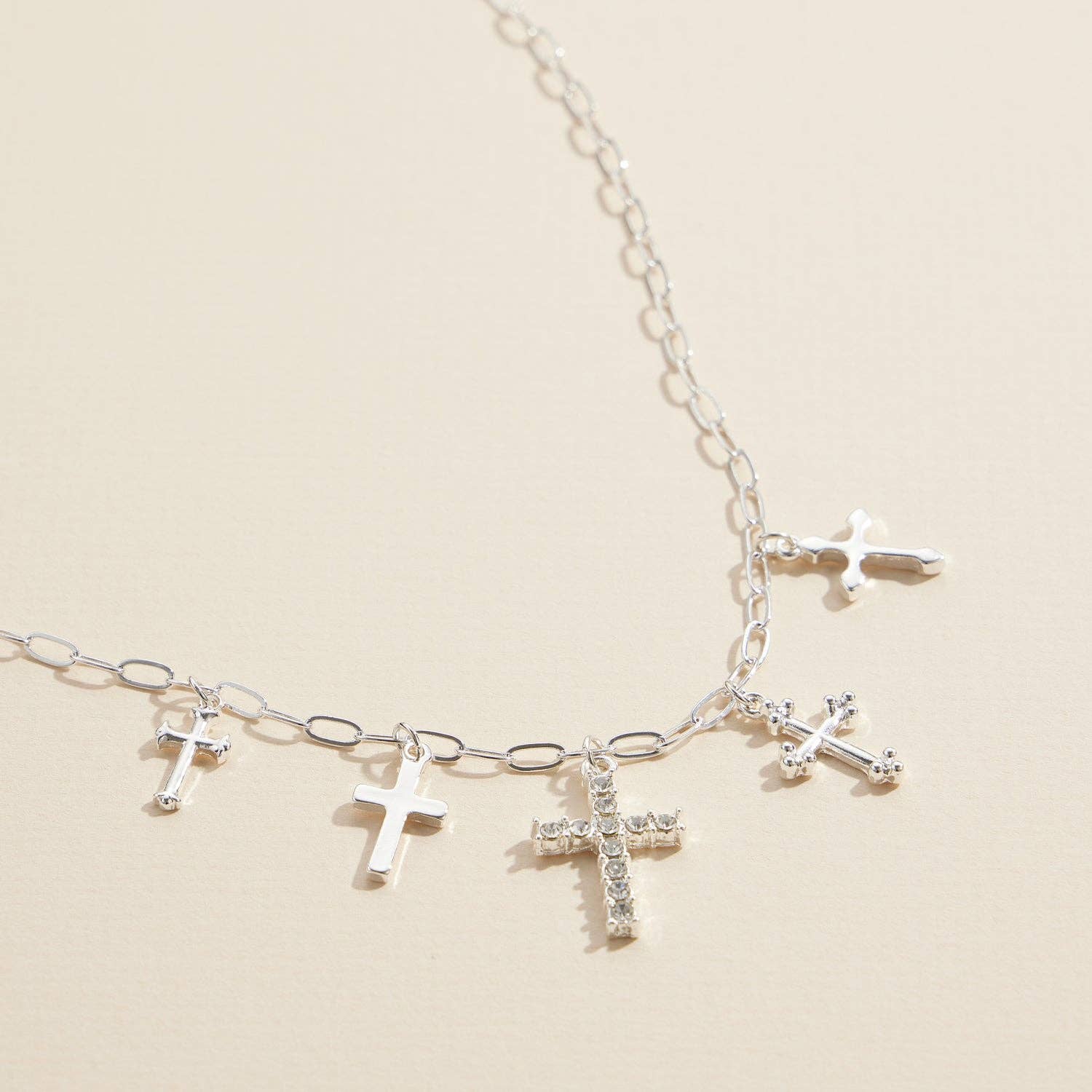 Elevate your style with this cross charm pendant necklace, available in gold-tone and silver-tone finishes. Featuring five delicate cross pendants, including one adorned with sparkling crystal accents, this necklace blends faith and fashion effortlessly. The adjustable chain ensures a perfect fit, making it ideal for daily wear or as a thoughtful religious gift for loved ones. Perfect for layering or wearing alone, this elegant piece adds a meaningful touch to any outfit.