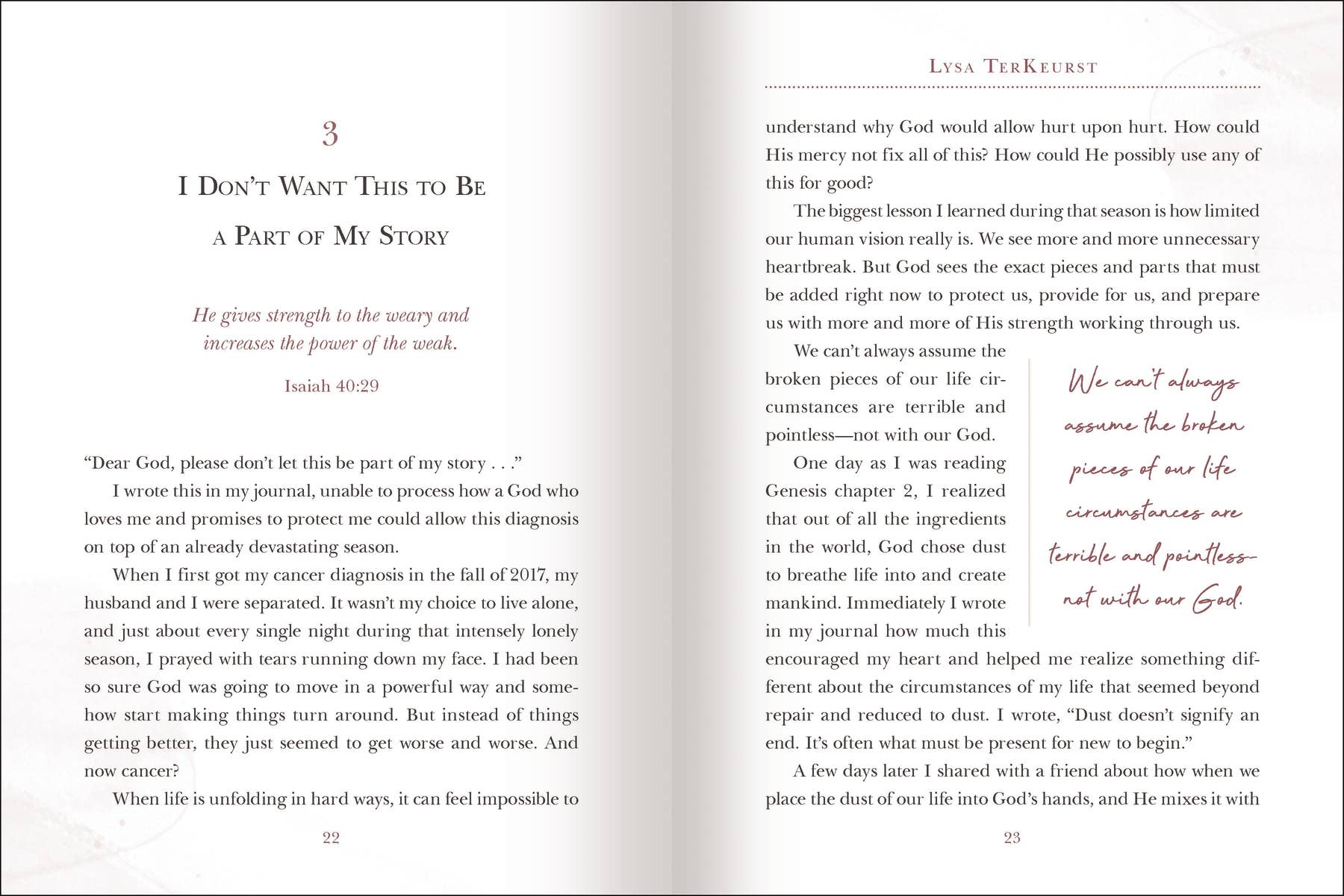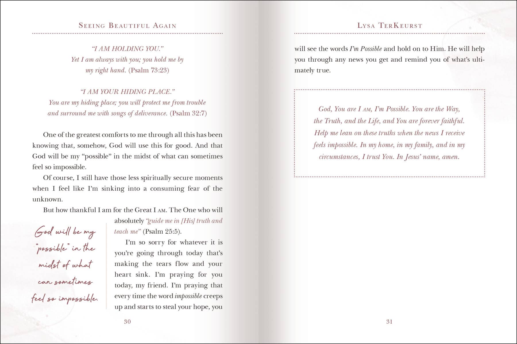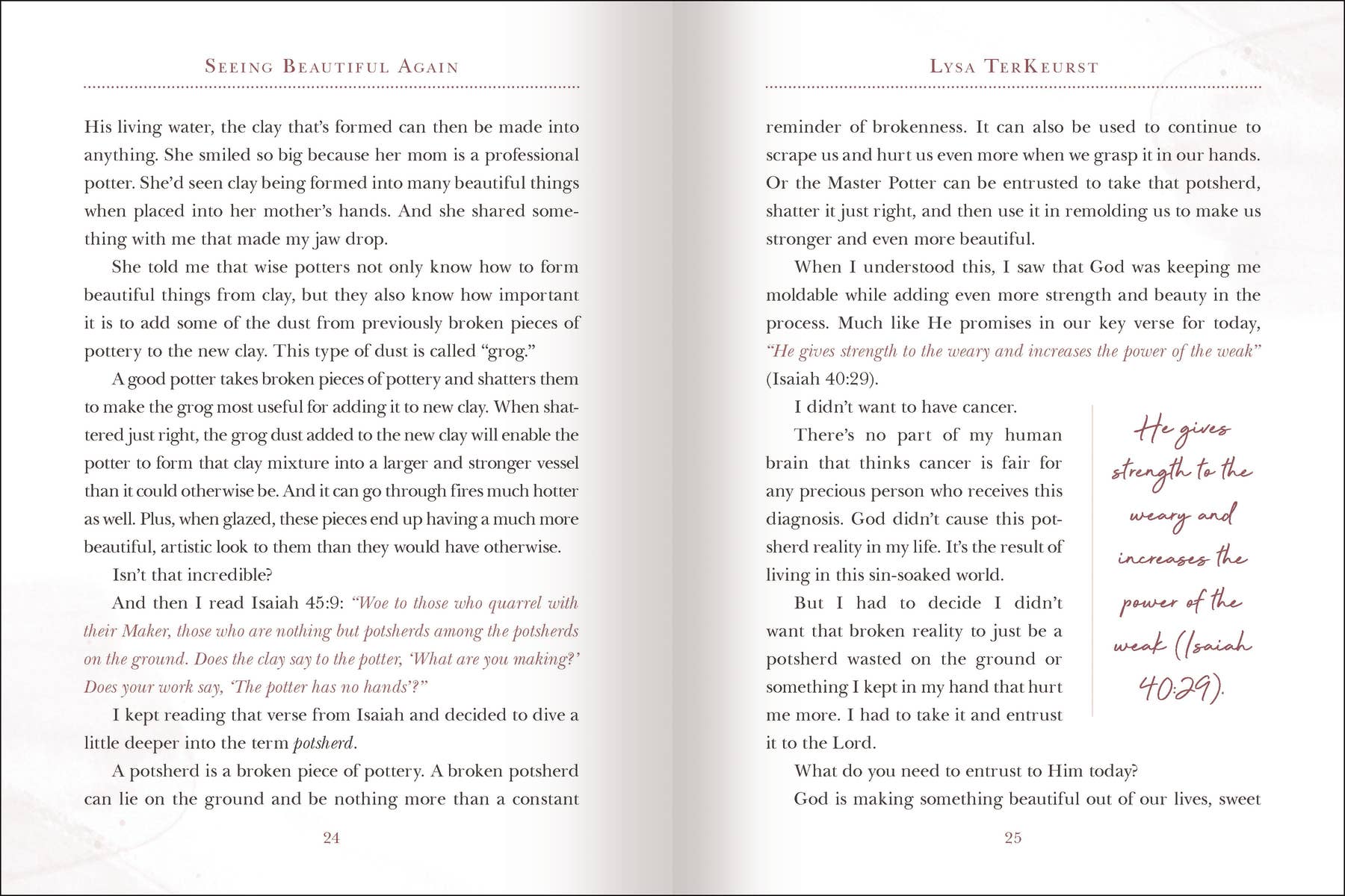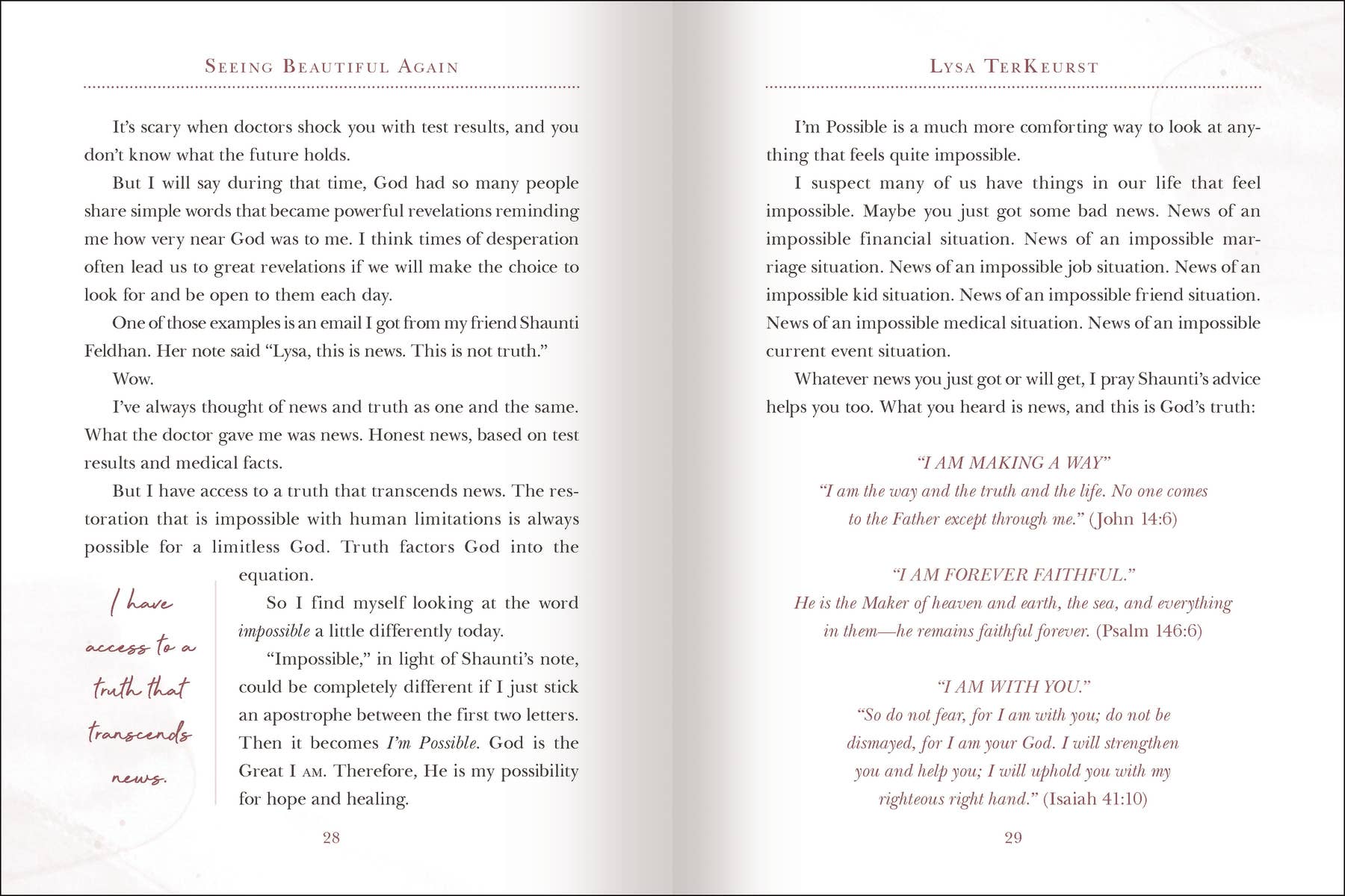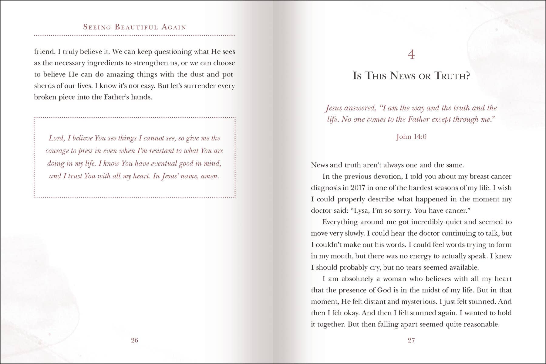 • From her personal journal and selections from her most recent books, New York Times bestselling author Lysa TerKeurst has chosen 50 devotions that are both compassionate and perspective-shifting. Seeing Beautiful Again will help you see God's goodness in the pieces of your story you didn't choose, didn't see coming, and don't know how to get past.